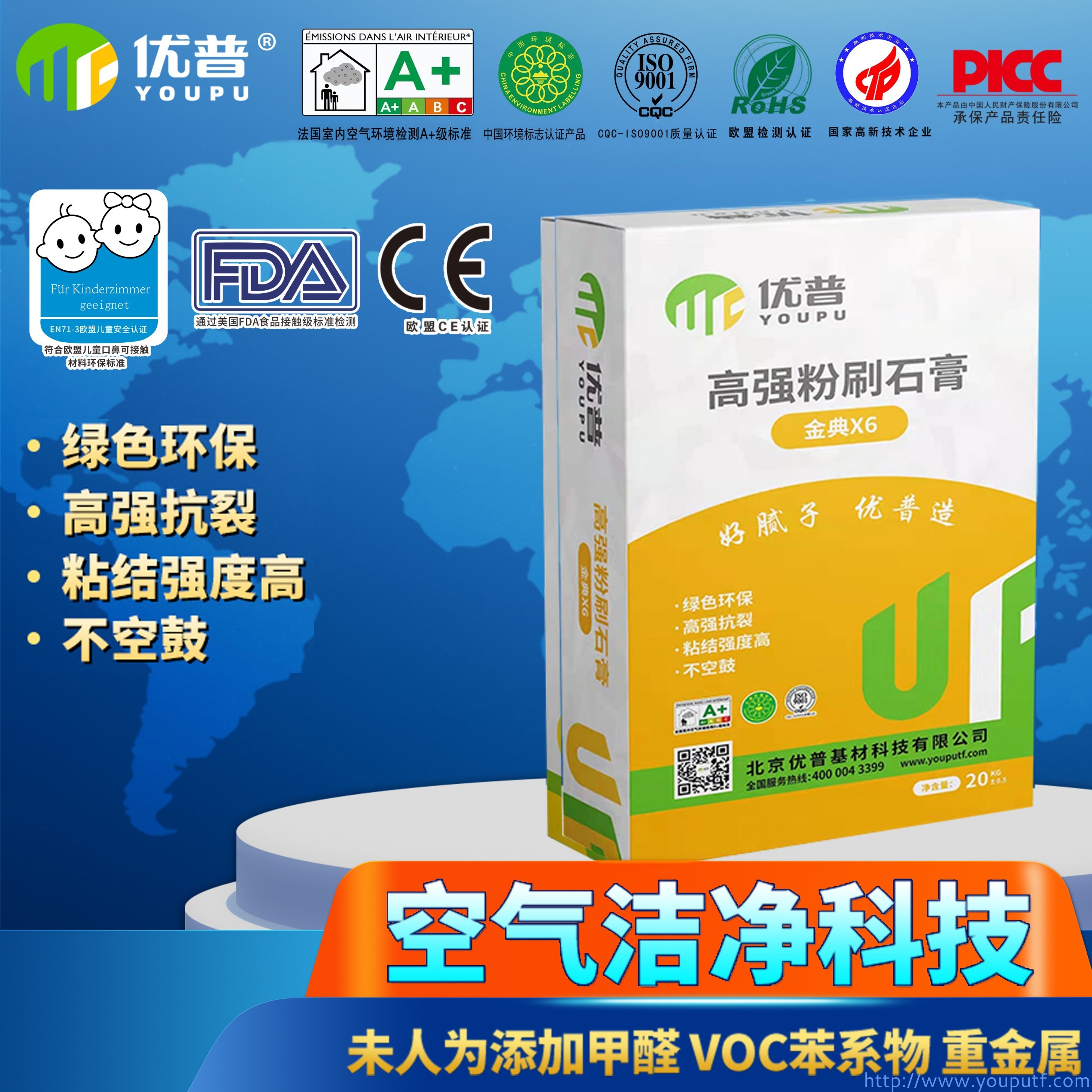 優普“金典X6系列”高強粉刷石膏,是優普公司最新產品,采用進口緩凝技術,與西卡公司長期戰略合作,由高強石膏、均勻細砂、碳酸鈣及添加劑混合而成的新型內墻面基層抹灰材料,具有良好的抗裂、嵌縫、填充和找平功能,適用于混凝土、加氣混凝土、磚混砂漿墻面基層抹灰找平 。綠色環保,歐洲標準,零醛零VOC,通過法國A+認證。